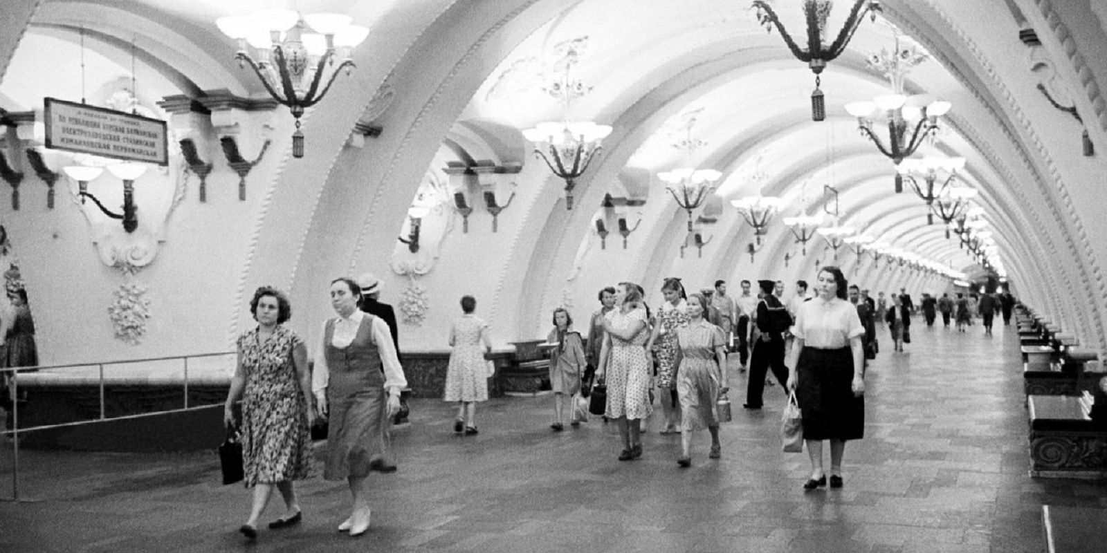 ![]() Пассажиры Московского метро на станции «Арбатская». Фото В.Мастюкова, 28 июня 1961 года, Главархив Москвы. |